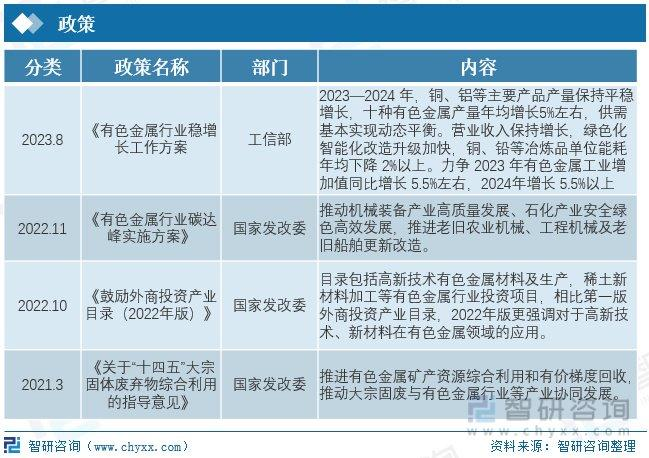 為了實現(xiàn)有色金屬行業(yè)的穩(wěn)定增長,我國政府部門發(fā)布了一系列政策及發(fā)展規(guī)劃。2023年8月,工信部發(fā)布《有色金屬行業(yè)穩(wěn)增長工作方案》,其中提到2023年-2024年我國有色金屬的發(fā)展目標(biāo)為銅、鋁等主要產(chǎn)品產(chǎn)量保持平穩(wěn)增長,十種有色金屬產(chǎn)量年均增長5%左右,供需基本實現(xiàn)動態(tài)平衡。營業(yè)收入保持增長,綠色化智能化改造升級加快,銅、鉛等冶煉品單位能耗年均下降2%以上。力爭2023年有色金屬工業(yè)增加值同比增長5.5%左右,2024年增長5.5%以上。2022年11月,國家發(fā)改委在《有色金屬行業(yè)碳達(dá)峰實施方案》中提出推動機(jī)械裝備產(chǎn)業(yè)高質(zhì)量發(fā)展、石化產(chǎn)業(yè)安全綠色高效發(fā)展,推進(jìn)老舊農(nóng)業(yè)機(jī)械、工程機(jī)械及老舊船舶更新改造。2022年10月,國家發(fā)改委在《鼓勵外商投資產(chǎn)業(yè)目錄(2022年版)》更強(qiáng)調(diào)對于高新技術(shù)、新材料在有色金屬領(lǐng)域的應(yīng)用。2021年3月,國家發(fā)改委提出《關(guān)于“十四五”大宗固體廢棄物綜合利用的指導(dǎo)意見》,其中強(qiáng)調(diào)推進(jìn)有色金屬礦產(chǎn)資源綜合利用和有價梯度回收,推動大宗固廢與有色金屬行業(yè)等產(chǎn)業(yè)協(xié)同發(fā)展。