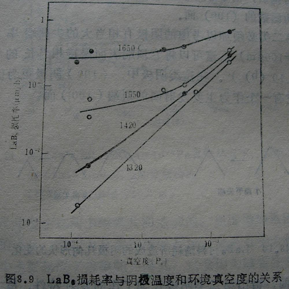 LaB6陰極的壽命特征,即長期工作的發(fā)射性能主要由LaB6材料的消耗所決定。LaB6的消耗量是由于材料的熱蒸發(fā)所致,隨著溫度的升高和真空度的變壞,消耗量增大。