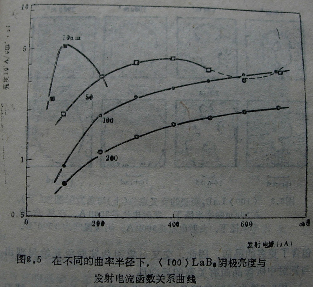 實驗指出,尖端曲率相當(dāng)小時,可以得到低功函數(shù)LaB6所希望有的高亮度。但在長期工作時間內(nèi),小曲率半徑的陰極僅僅在經(jīng)過較短的工作時間后,尖端的小球面消失。100μm的大曲率半徑在超過1500小時后,仍能保持垂直于光軸的(100)面,因而提供了相當(dāng)穩(wěn)定的發(fā)射。