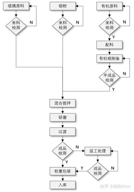 正面銀漿的生產(chǎn)工藝為:將銀粉、玻璃粉(或樹脂)、有機(jī)相等物質(zhì)進(jìn)行配料,隨后放入機(jī)械設(shè)備內(nèi)混合攪拌、研磨,控制攪拌、研磨工藝參數(shù),過濾泄出銀漿,產(chǎn)品性能檢查、包裝、入庫(kù)等。