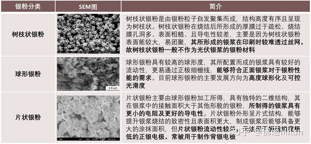 由上可知,銀粉是生產(chǎn)光伏漿料最重要的原料,其形貌、粒徑、分散性及振實(shí)密度等特性皆對(duì)其電性能、接觸性、流動(dòng)性有重要影響。根據(jù)銀粉的外貌不同,可將銀粉分為球狀銀粉、片狀銀粉以及枝狀結(jié)構(gòu)銀粉,不同形狀的銀粉將引起銀漿燒結(jié)厚膜結(jié)構(gòu)的不同,從而對(duì)電池片性能有所影響。