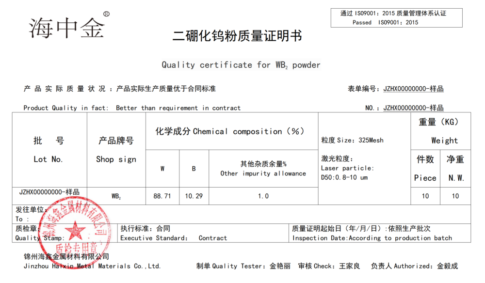 性質:硼化鎢的結構為八角形晶體,外觀為黑色粉末狀,密度為1.6 g/ml,熔點為2670℃,不溶于水,能溶于王水,具有大硬度,高韌性,耐磨損,耐高溫,耐腐蝕,良好的化學穩(wěn)定性和導電性,及對中子有優(yōu)異的吸收效果等特點。