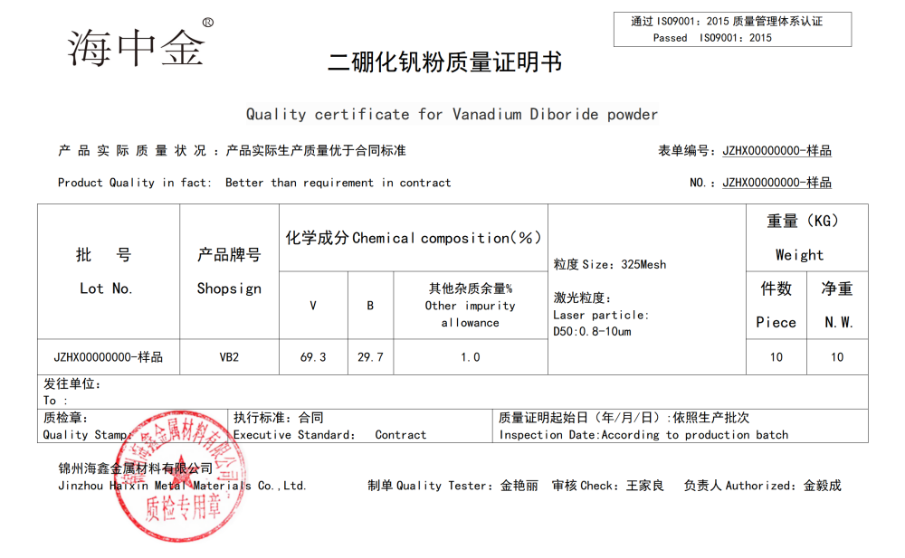 合成方法:將元素硼和元素釩按比例混合后,加壓成型,在加熱爐中加熱制得。