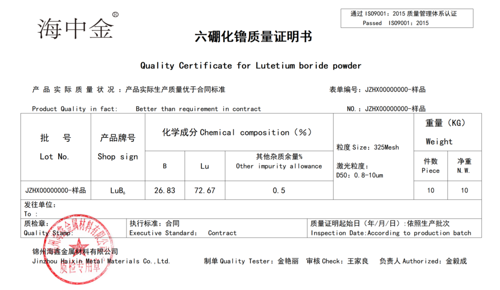 產(chǎn)品名稱:六硼化镥(LuB6)