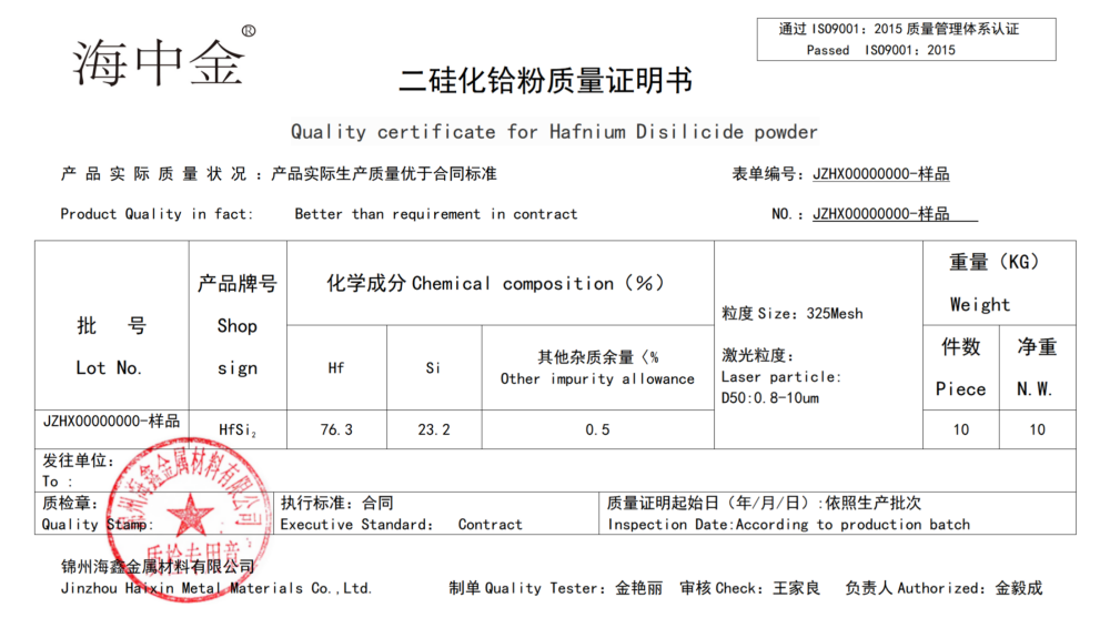 產(chǎn)品名稱:二硅化鉿(HfSi2)